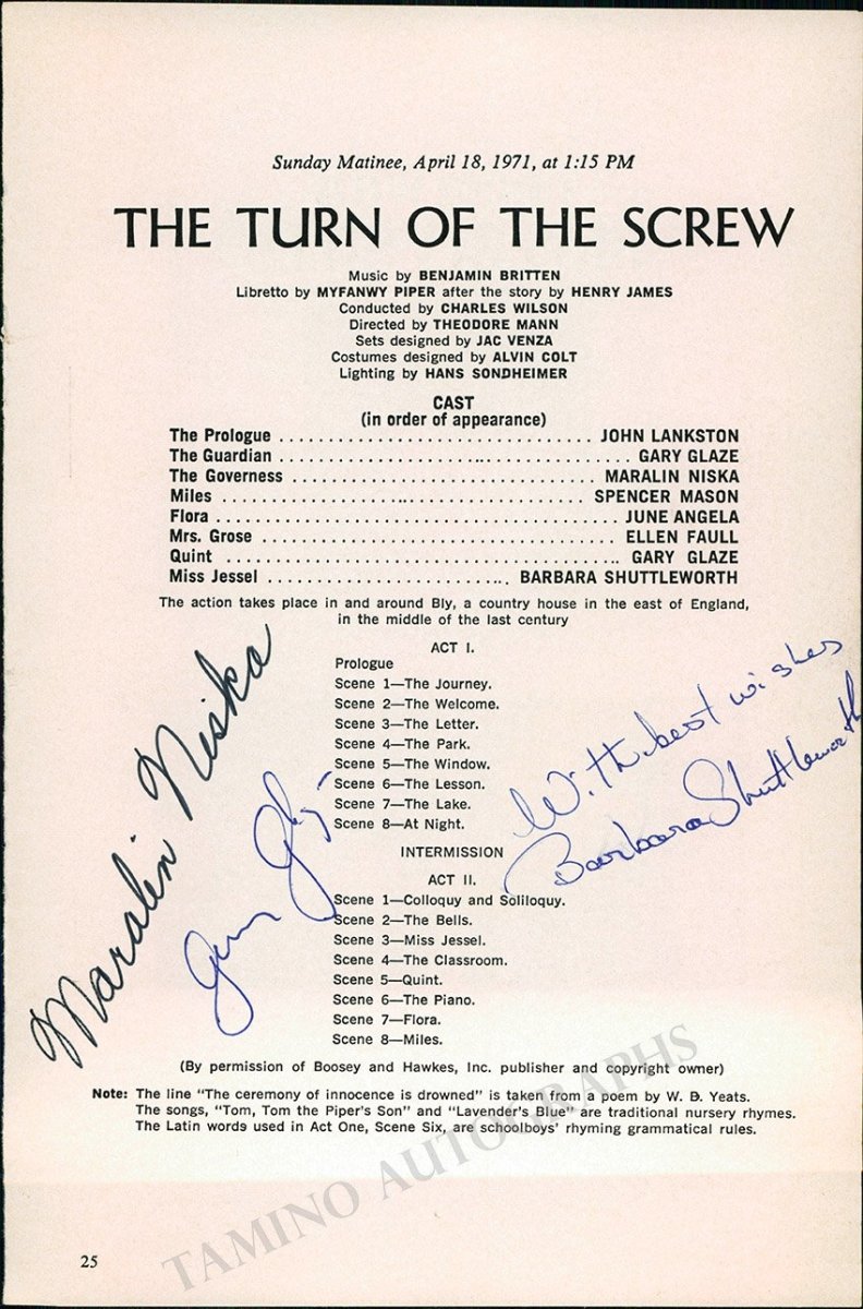 Cast page from a performance of Britten's The Tun of the Screw in 1971, signed by the three above mentioned singers.