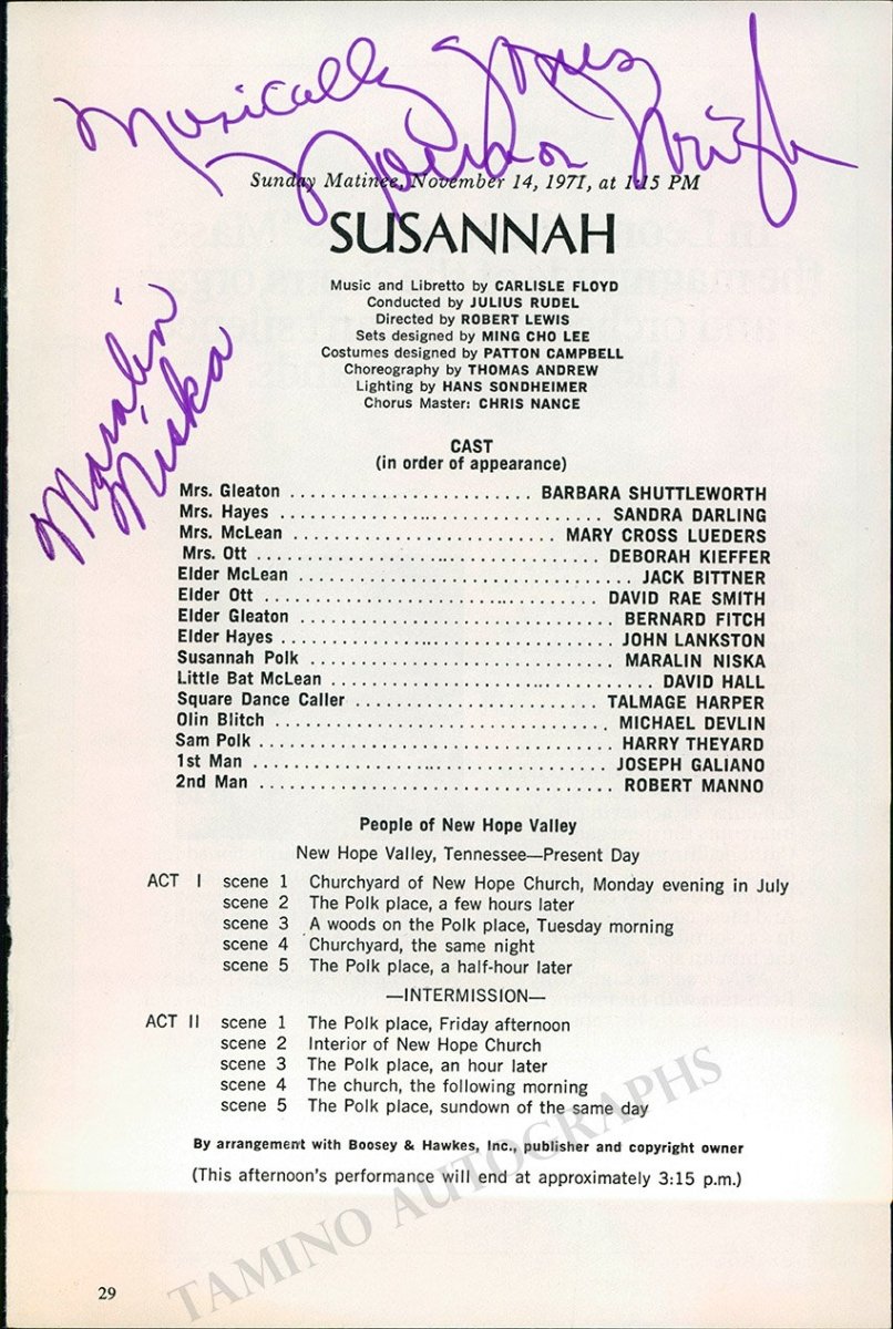 Cast page from a performance of Floyd's Susannah in 1971, signed by the two above mentioned singers.