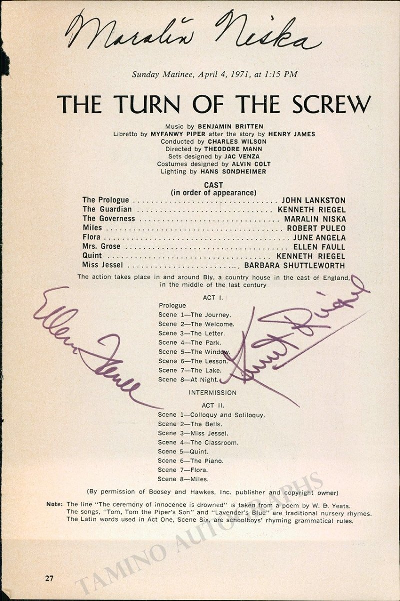 Cast page from a performance of Britten's The Turn of the Screw in 1971, signed by the three above mentioned singers. Size is 5.5 x 9 inches.
