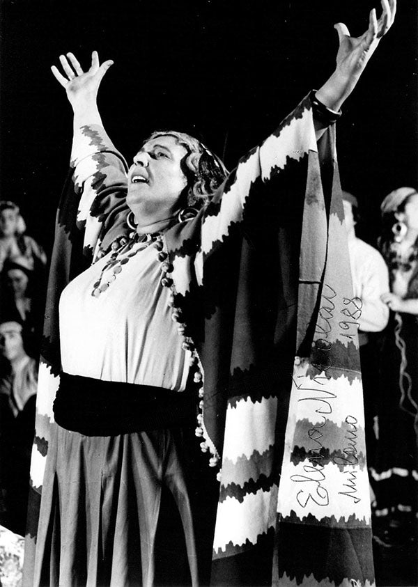 Signed photograph, shown in role (likely Azucena in Verdi's Il Trovatore), dated in Milan in 1988. Size is 5 x 6.75 inches, in excellent condition.
