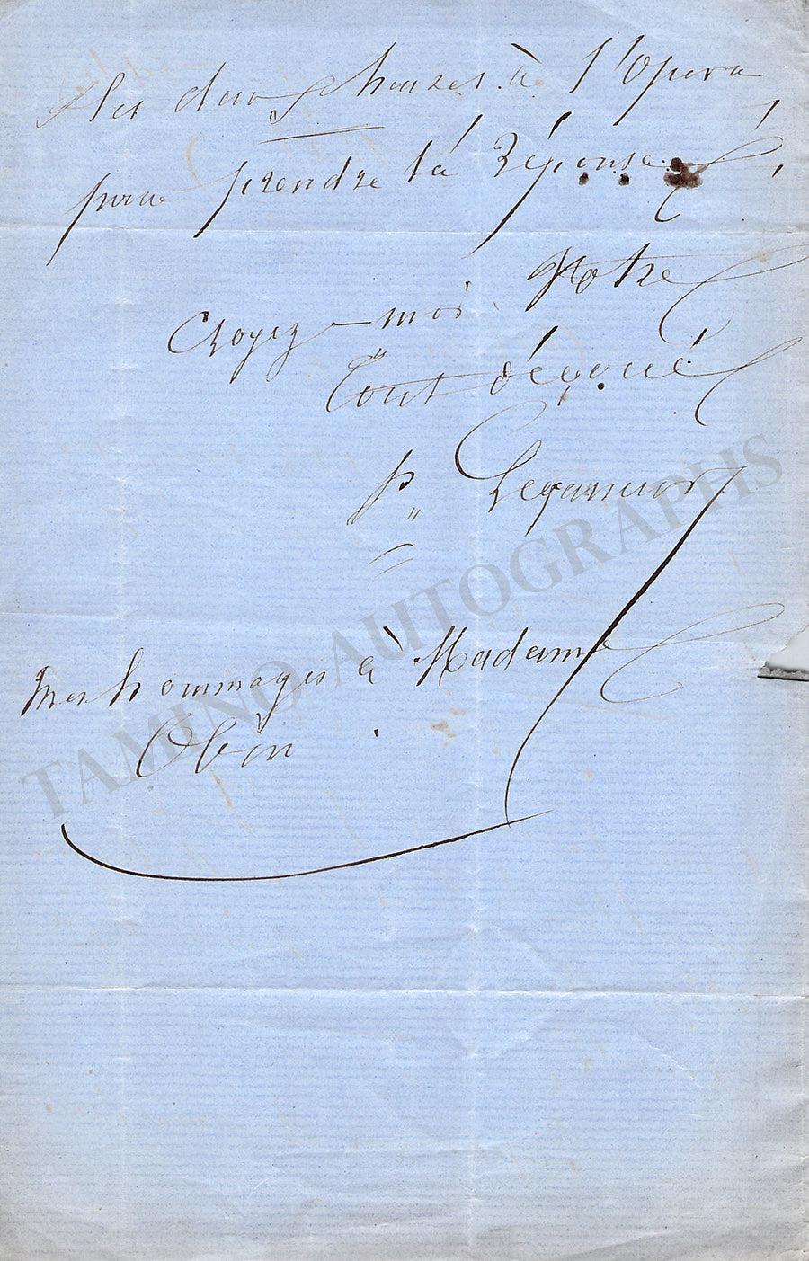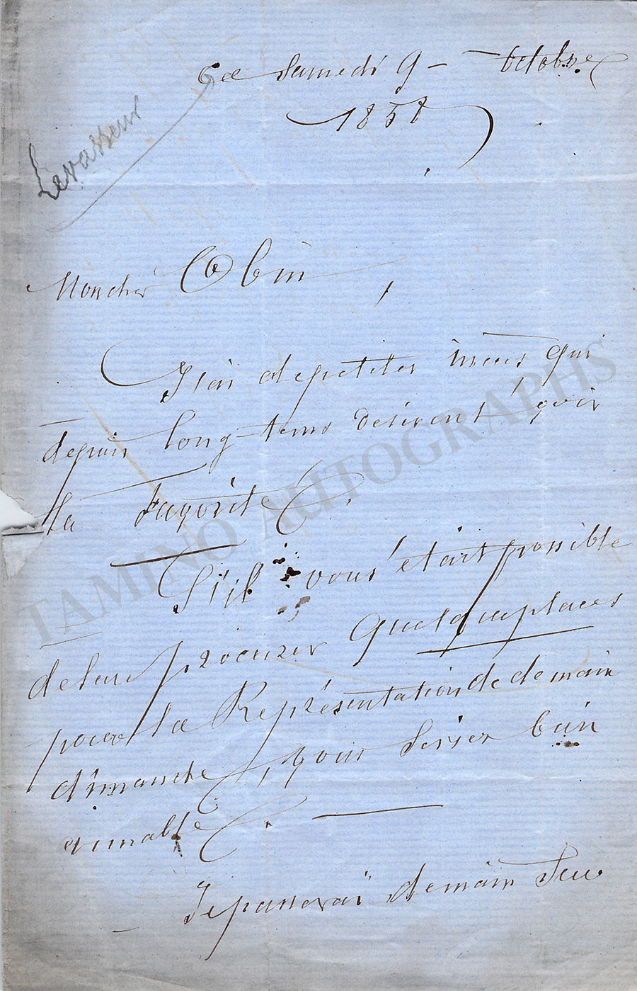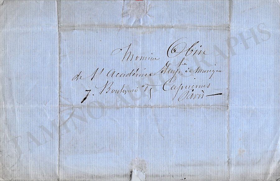 Autograph letter in French (untranslated) signed by him and dated in 1857. Size is 5.2 x 8.1 inches, 2 written pages in one folded sheet, in very good condition.