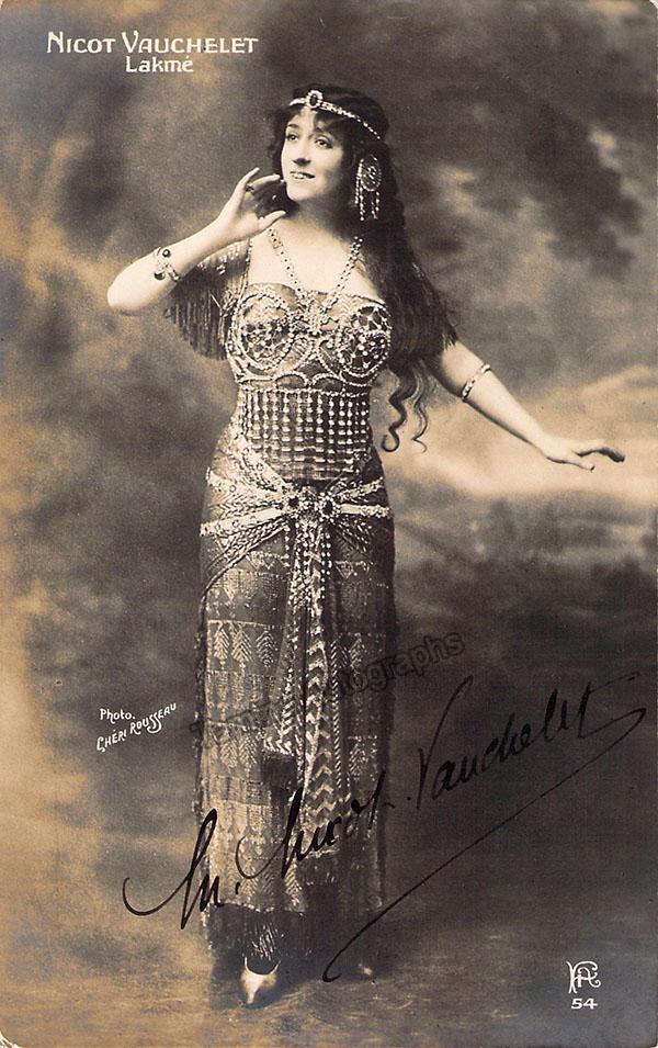 French soprano (1855-?), signed photo postcard, shown in the title role of Delibe's Lakme. Photo by Cheri Rousseau. Size is 3.5 x 5.5 inches, in excellent condition.