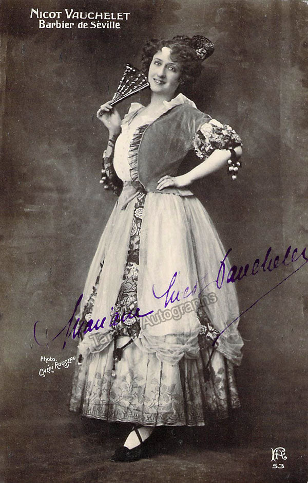 French soprano (1855-?), signed postcard photograph, shown as Rosina in Rossini's Barbiere di Siviglia. Photo by Cheri Rousseau. Size is 3.5 x 5.5 inches, very slight paper loss on edges, otherwise in excellent condition.