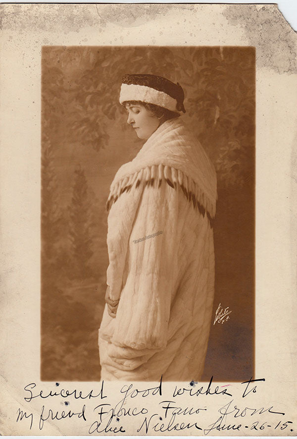 American soprano (1876-1943), signed photograph, shown either as herself or in role, inscribed and dated in 1915. Printed signature of photographer on front right of the photo. Size is 7 x 10 inches, paper loss and cut on top right and some creases on edges as well as rust at the top not affecting the image and signature. Priced accordingly.