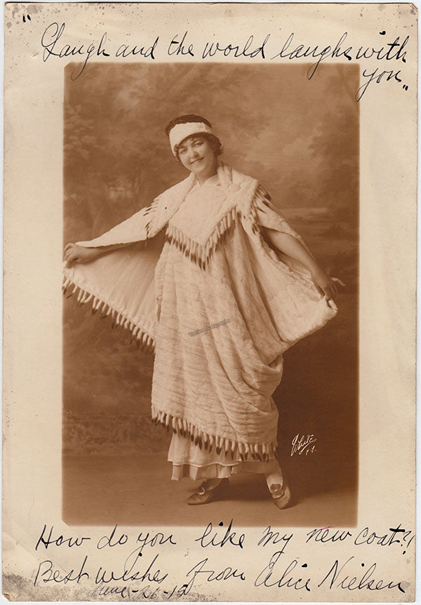 American soprano (1876-1943), signed photo, shown most likely in role, inscribed and dated in 1915. Printed signature of photographer is on the front right. Size is 7 x 10 inches, some rust and creases on edges, otherwise in excellent condition.