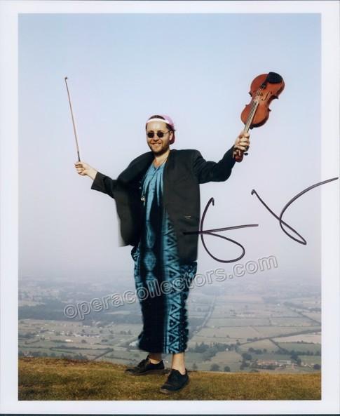 British violinist (b.1956), well-known for his performances and recordings - as well as for his excentric style. Signed photo showing him with his violin, 8 x 10 inches