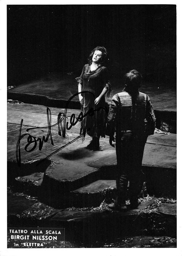 Swedish star soprano (1918-2005), signed photo, shown in Elektra at Teatro, La Scala. Stamped on verso by photographer Erio Piccagliani, Milan. Size is 4 x 5.75 inches.