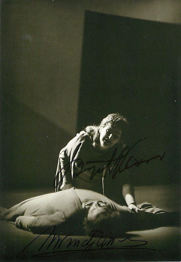 Swedish star soprano (1918-2005), double signed photo, shown as Tristan and Isolde. Stamped on verso by photographer Lauterwasser, Bayreuth. Size is 4 X 5.75 inches.