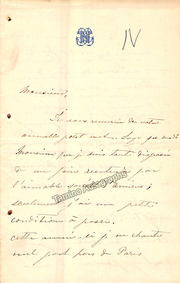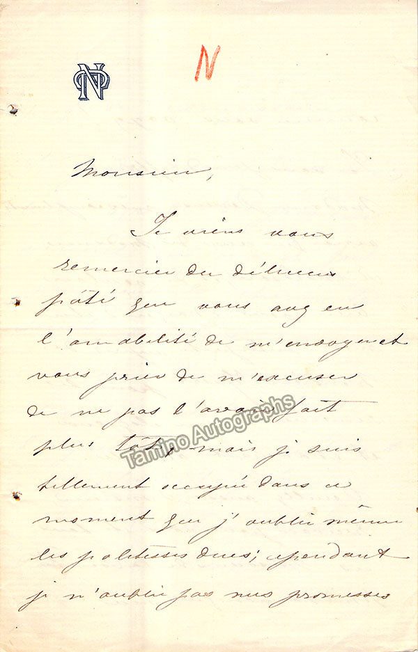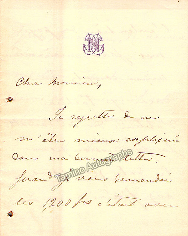 Set of 3 autograph letters signed, each of them have embossed letterheads, are 3 pages in length, written in French, and sold untranslated. One letter has a page size of 5.25 x 8 inches, dated in Paris in 1866, another is 4.5 x 7 inches, and the other is 4 x 5 inches. Each has small folds and bullet holes, otherwise in excellent condition. Not sold separately.