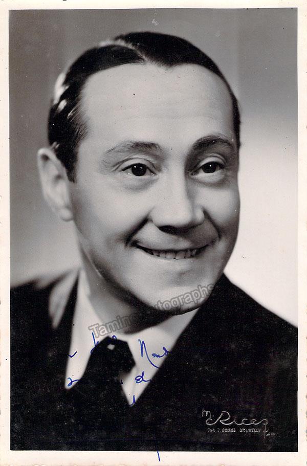 French tenor (1892-1967), signed photo, shown as himself. Inscribed with short sentiment. Stamped on verso by photographer M. Rices. Size is 4.5 x 7 inches, significant bending on corners and serrated edges but otherwise in good condition. Discount reflected in price.