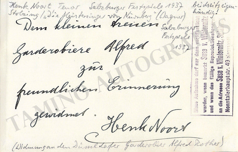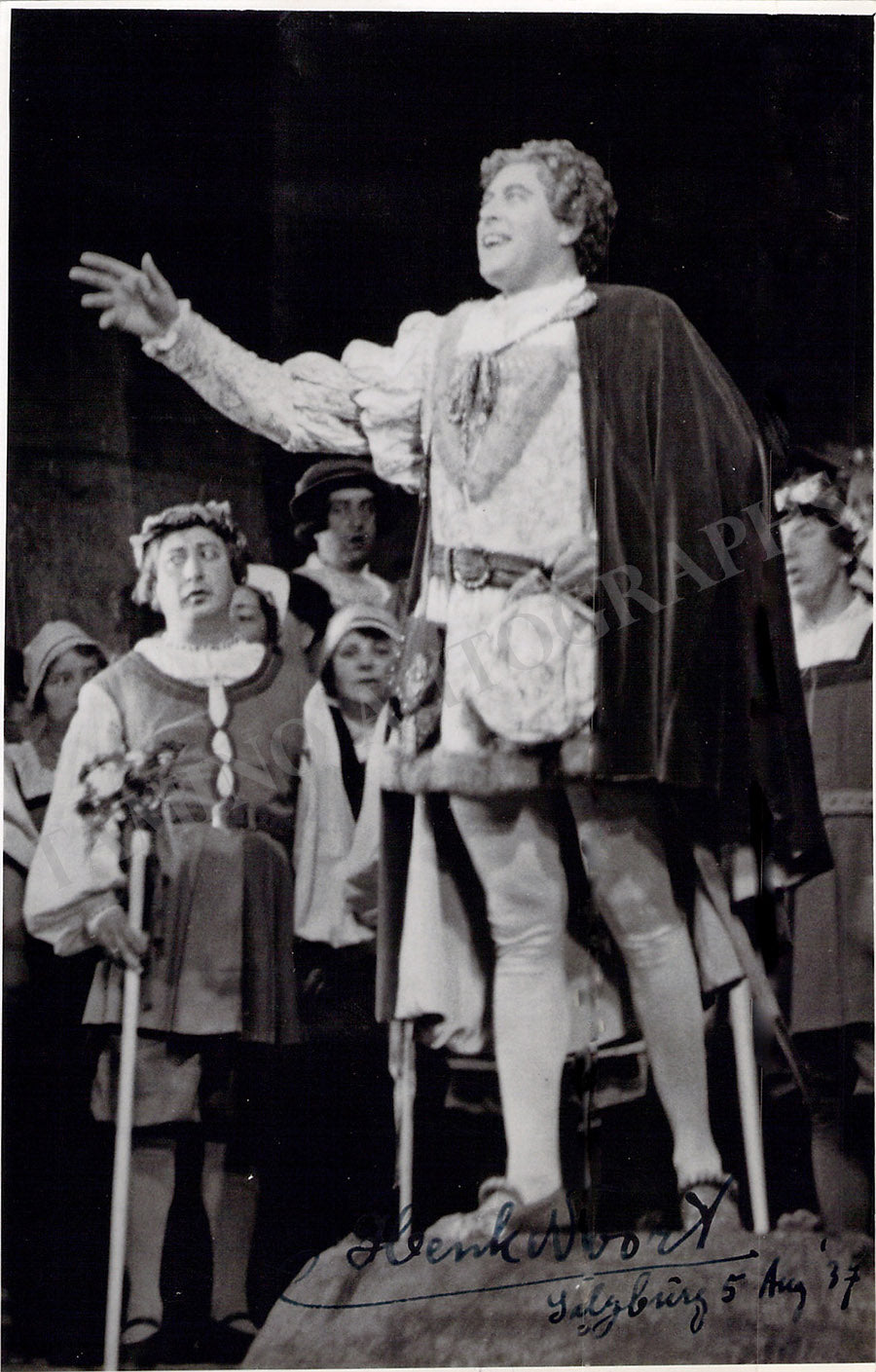 Signed photograph, shown as Walther von Stolzig in Wagner's Die Meistersinger, signed on front with additional signature and inscription on verso, dated in Salzburg in 1937. Stamped on verso by photographer Suze v. Winternitz, Salzburg. Size is 4.5 x 6.75 inches, in very good condition.