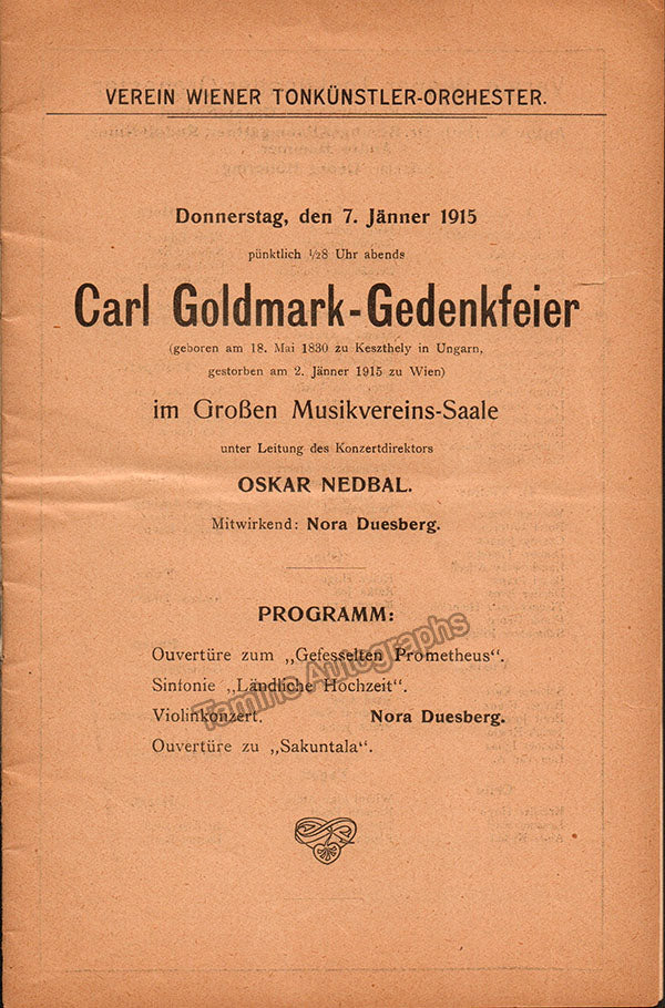 Program for a performance of the Swedish violinist (1895-1982) with the Verein Wiener Tonkünstler-Orchester under the baton of Oskar Nedbal, in Vienna, on January 7th, 1915, as part of an In Memoriam concert of the then recently deceased composer Carl Goldmark.