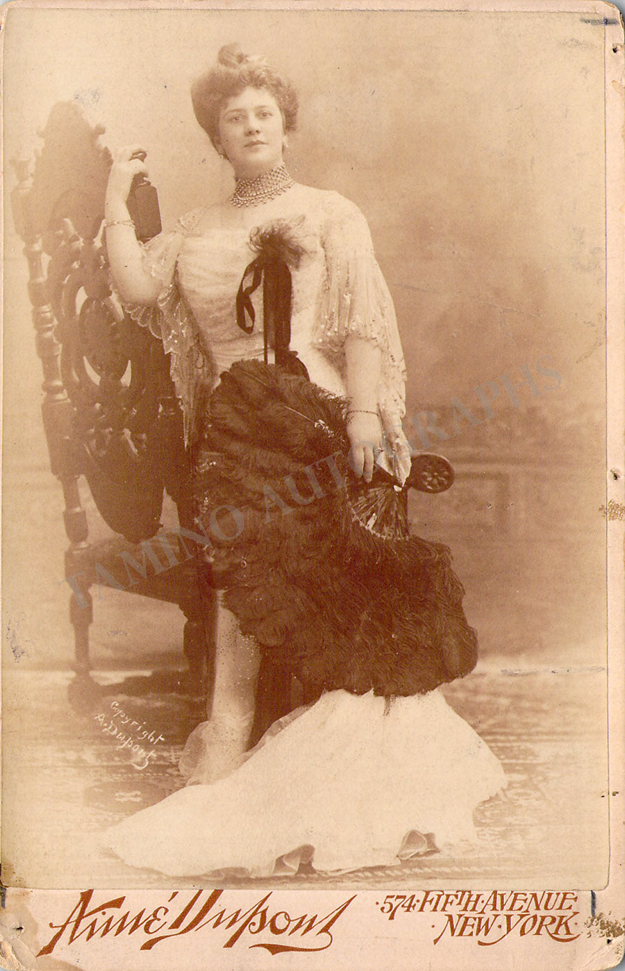 American star soprano (1857-1914), one of the greatest in her time, toured extensively through Europe, America, Australia and Asia where she died while touring. Unsigned cabinet photograph, shown most likely in role by photographer Aime Dupont, New York. Photo is 4.25 x 6.5 inches, small creases on various corners, otherwise in very good condition.