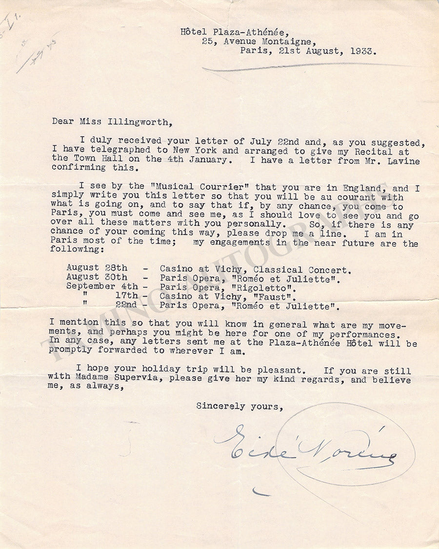 Norwegian soprano and actress (1884-1968), typed letter signed, 1 page written in English, dated in Paris in 1933. Size is 8 x 10 inches, small tear on the middle right side of the document, and several small creases and folds, otherwise in very good condition.