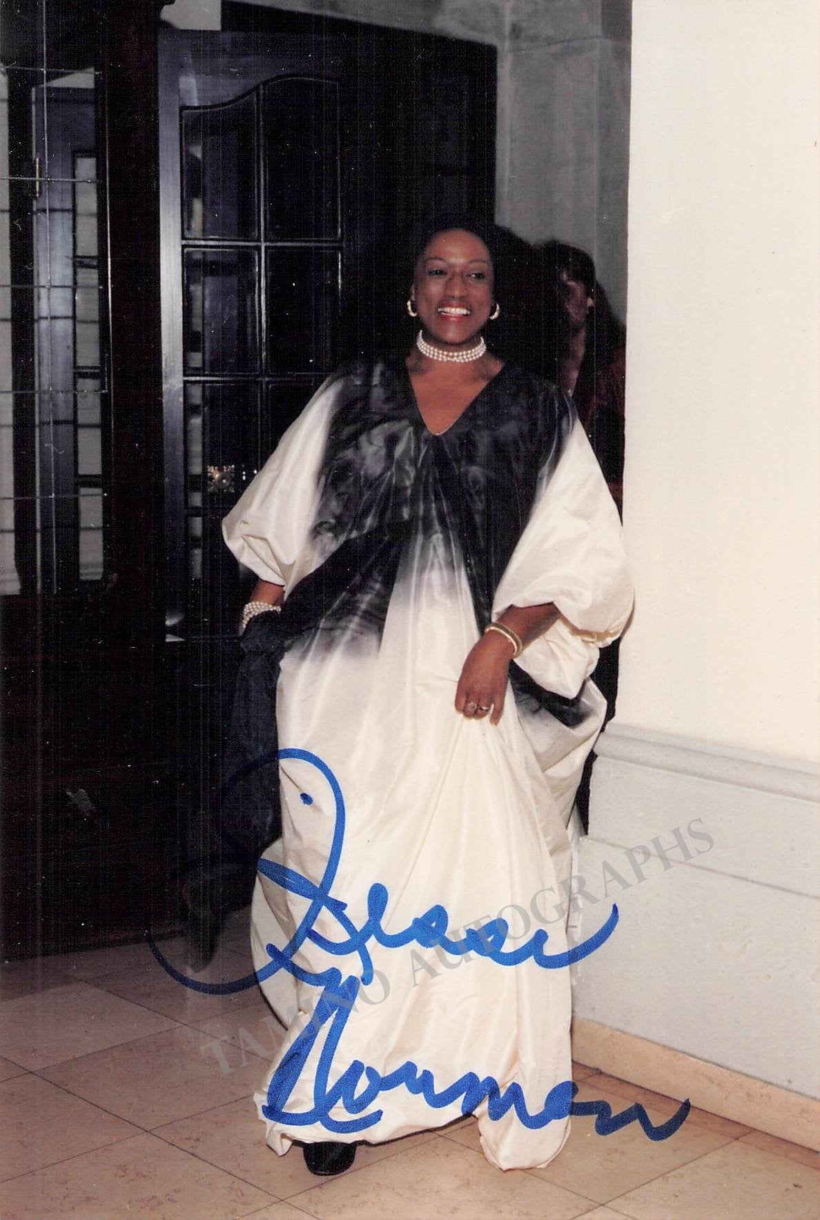 Superstar American soprano (1945-2019), celebrated worldwide as opera singer and recitalist, both classical and gospel music. Signed photograph, shown as herself. Stamped on verso by photographer Schaffler, Salzburg. Size is 4 x 6 inches, in excellent condition.