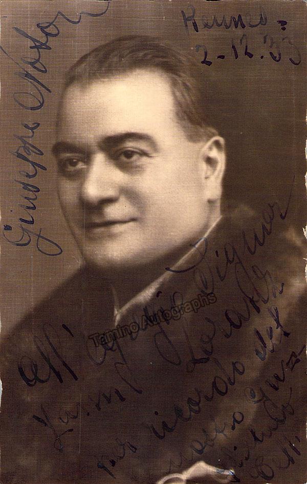 Italian baritone (1883-1979), signed photo postcard, shown as himself, dated in 1933. Extensive inscription and sentiment. Stamped on verso by Fratelli Rinaldi photographers, Brescia. Size is 3.5 x 5.5 inches, serrated edges but otherwise in excellent condition.
