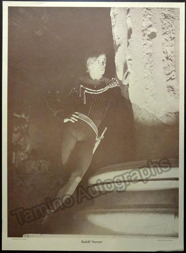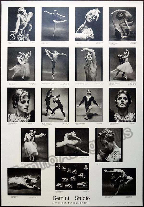 Superstar Russian ballet dancer (1938-1993), one of the greatest of the 20th century. Lot of posters with his image (4), 2 with Baryshnikov (including one advertising a poster series with him and Natalia Makarova, 2 copies of this poster), one with Margot Fonteyn, one with Cynthia Gregory, that is, 8 posters, plus one repeat. Various sizes, ranging from 16.5 x 23.5 inches to 20 x 28 inches, all in excellent condition. Sold as a lot only.