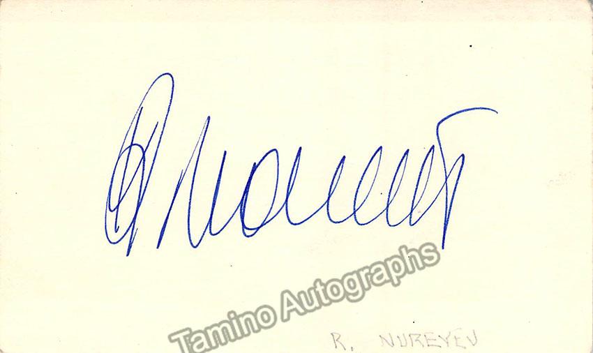 Superstar Russian ballet dancer (1938-1993), one of the greatest of the 20th century. Signed card, size is 5 x 3 inches, in excellent condition.
