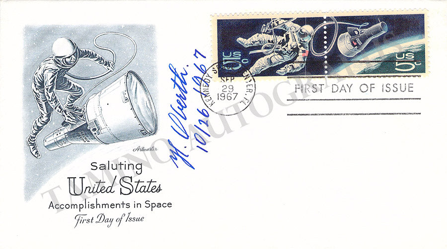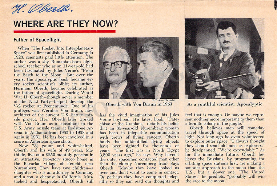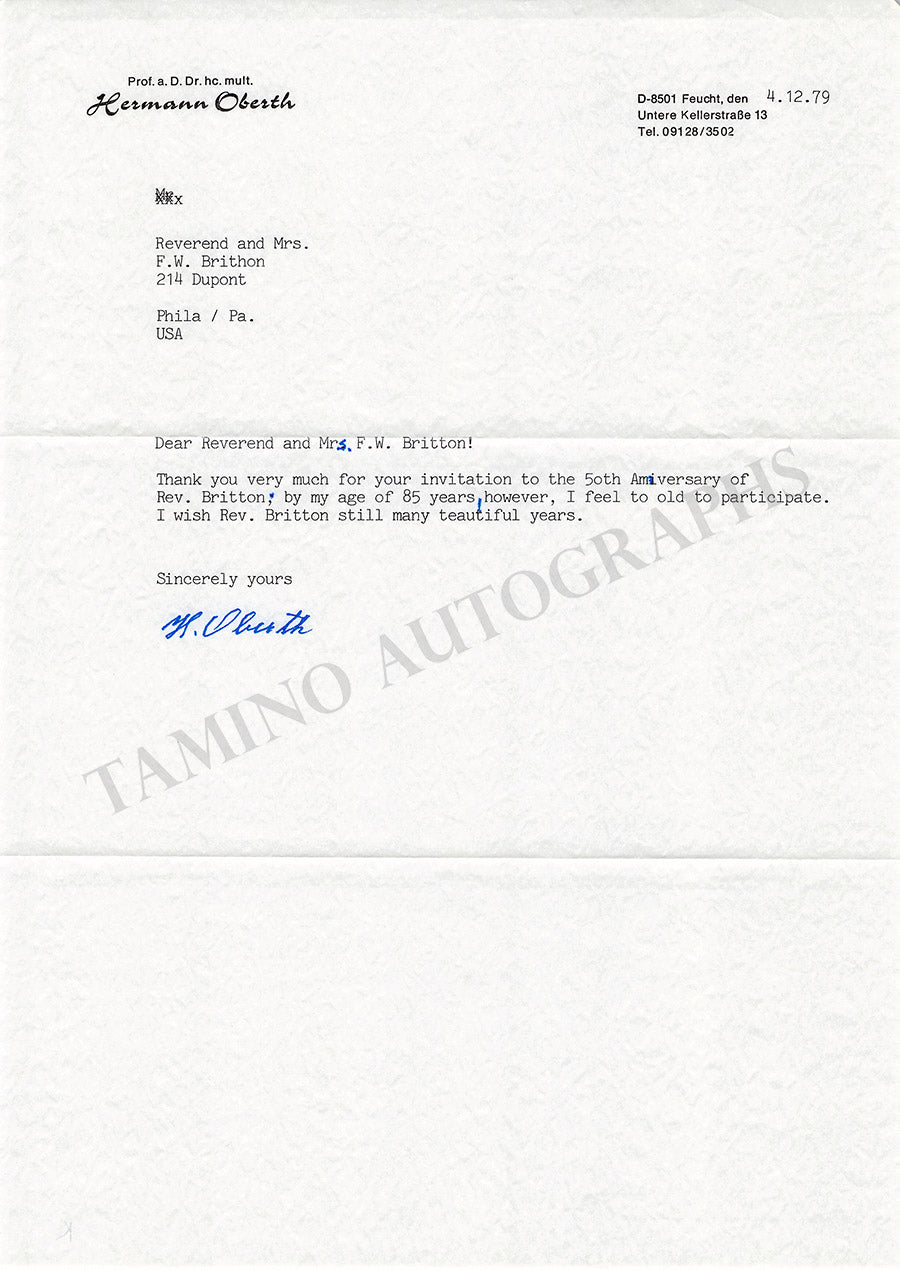 Lot of 4 autographed items including one signed 5 x 7 inch photo of him, one typed letter signed in English, dated in 1979, one signed First Day Cover (FDC) envelope with stamp commemorating the U.S. Space program, and one news story about him with his signature above the text. All signed as "H. Oberth". All in excellent condition, not sold separately.