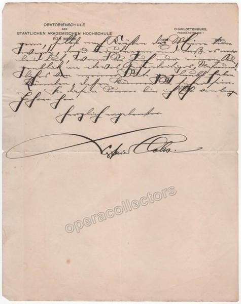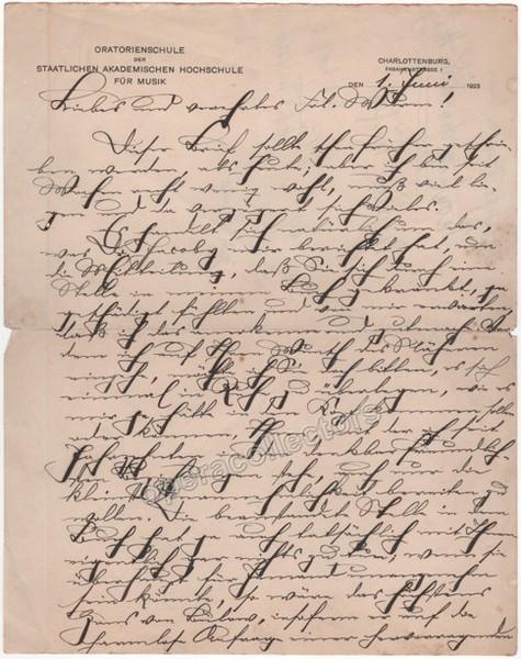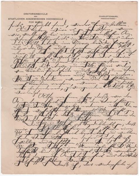 German choir-leader, conductor and composer (1858-1929), founder of the Philharmonic Choral Society of Berlin, which he lead until 1920. Ochs also composed an opera, 2 operettas, choruses and canons, and songs. Autograph letter handwritten by him and signed in the last page, dated in 1923, with letterhead from the Oratorienschule der Staatlichen Akademischen Hochschule fur Musik in Charlottenburg. Four pages handwritten only on one side, 8.75 x 11 inches, they have folds and minor cracks over the folds, otherwise in very good condition. Sold untranslated - rare!