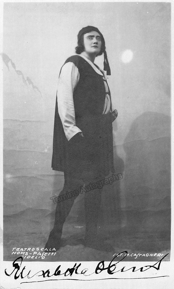 Dutch soprano (1888-1974), signed postcard photograph, shown in the title role of Beethoven's Fidelio. Photo by M. Catagneri. Size is 3.25 x 5.25 inches, mounting traces on verso, otherwise in very good condition.