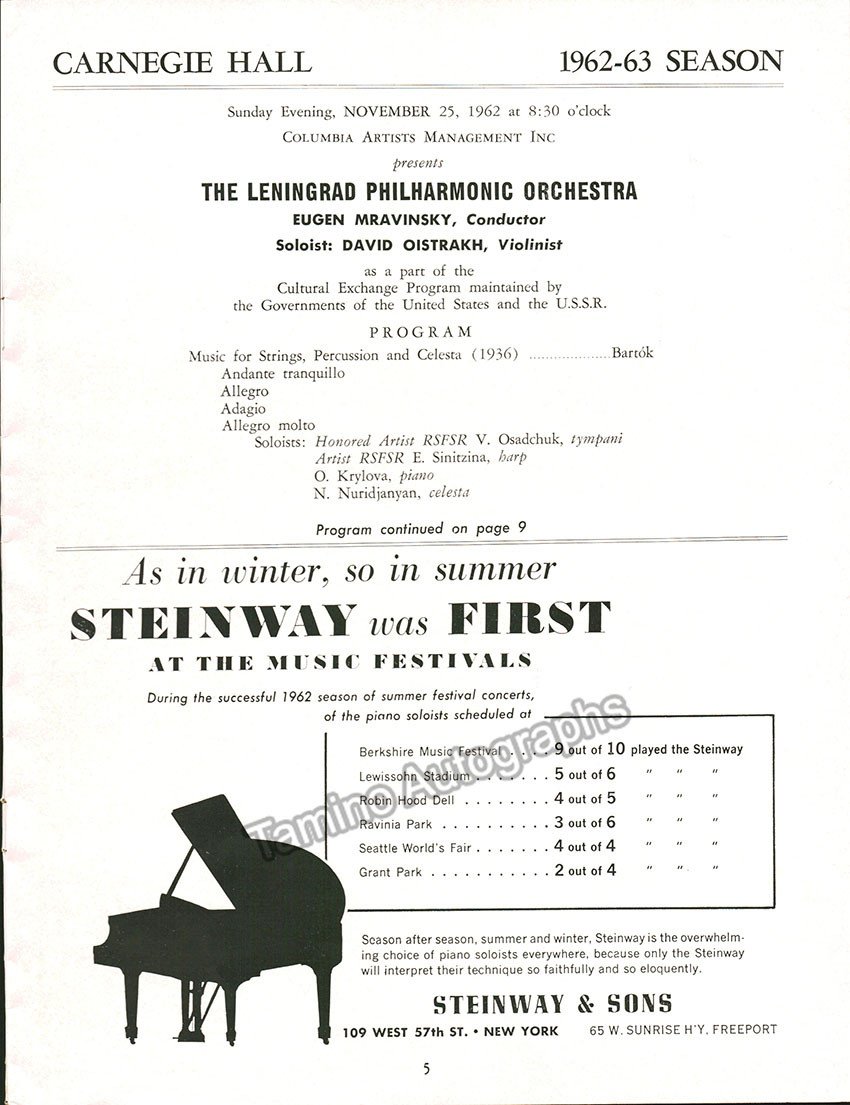 Program for a concert by David Oistrakh at Carnegie Hall, November 1962, with the Leningrad Philharmonic Orchestra under the baton of Yevgeny Mravinsky. Size is 8.5 x 11 inches, full program, in excellent condition.