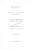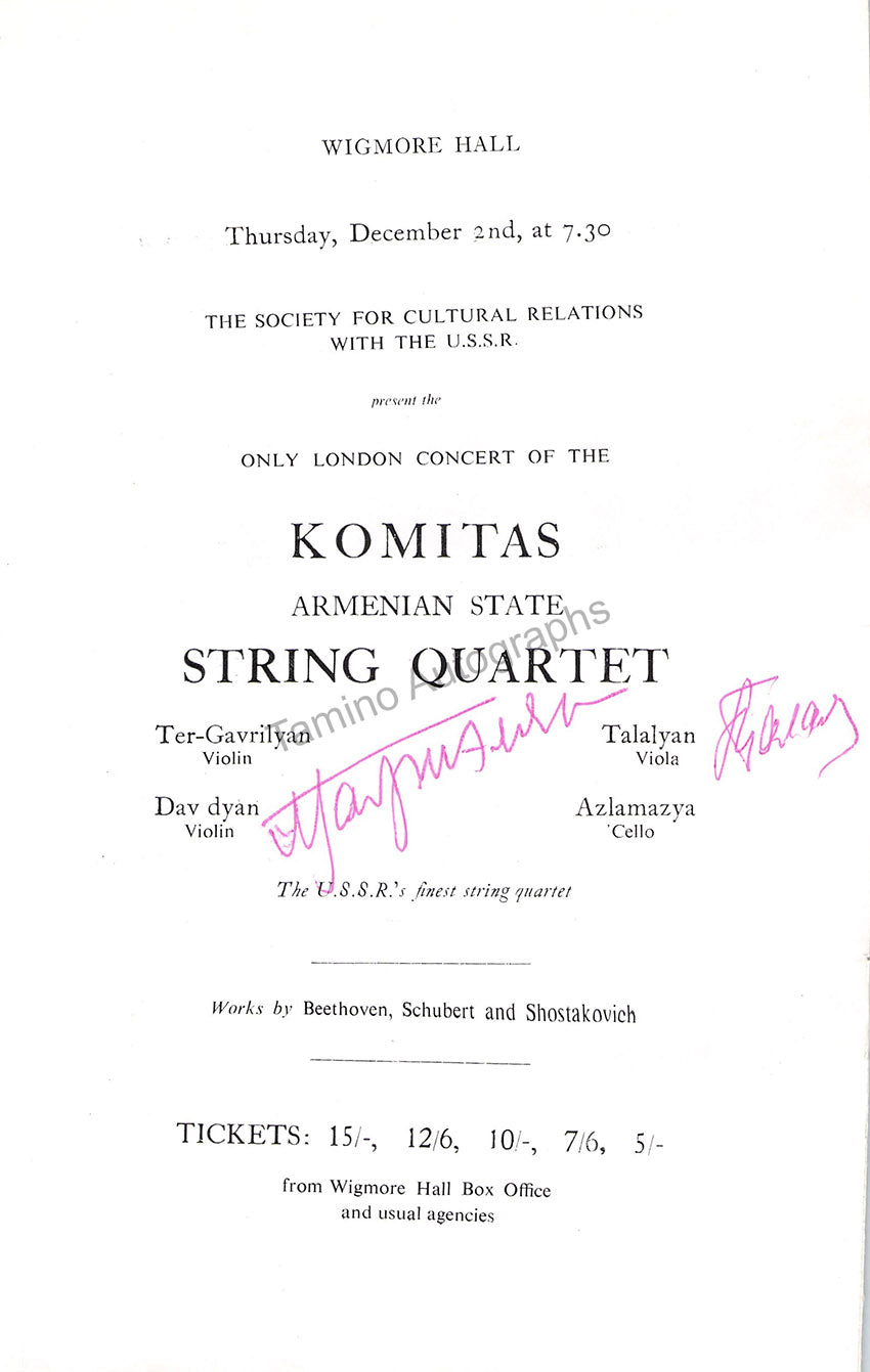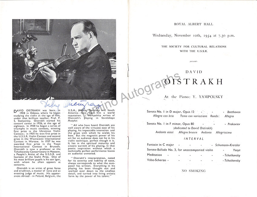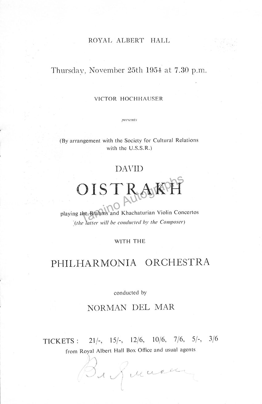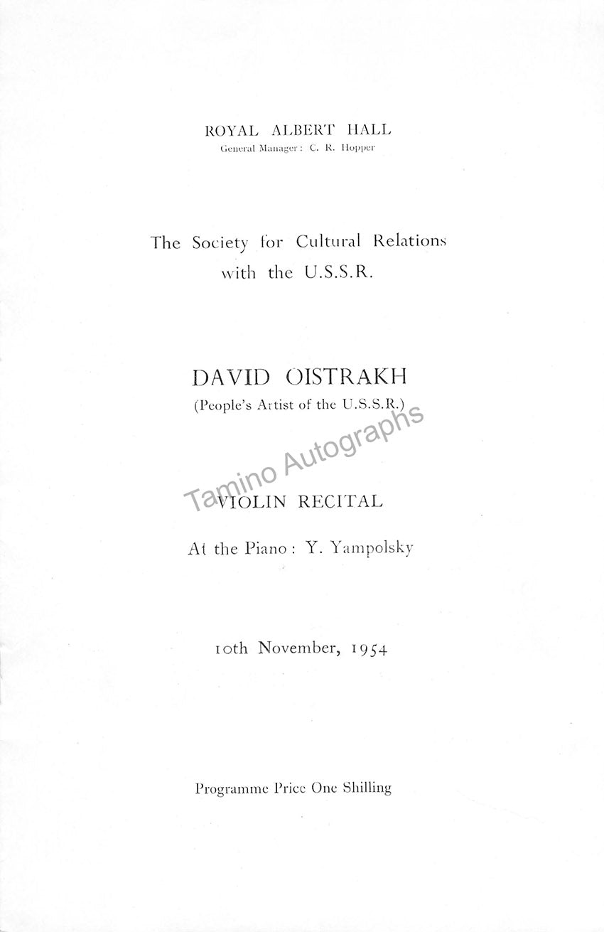 Program for a recital of the star Russian violinist with pianist Y. Yampolsky at The Royal Festival Hall, London, on November 10th, 1954, signed by the violinist, plus one unidentified signature on the first page and two signatures by members of the Armenian State String Quartet.