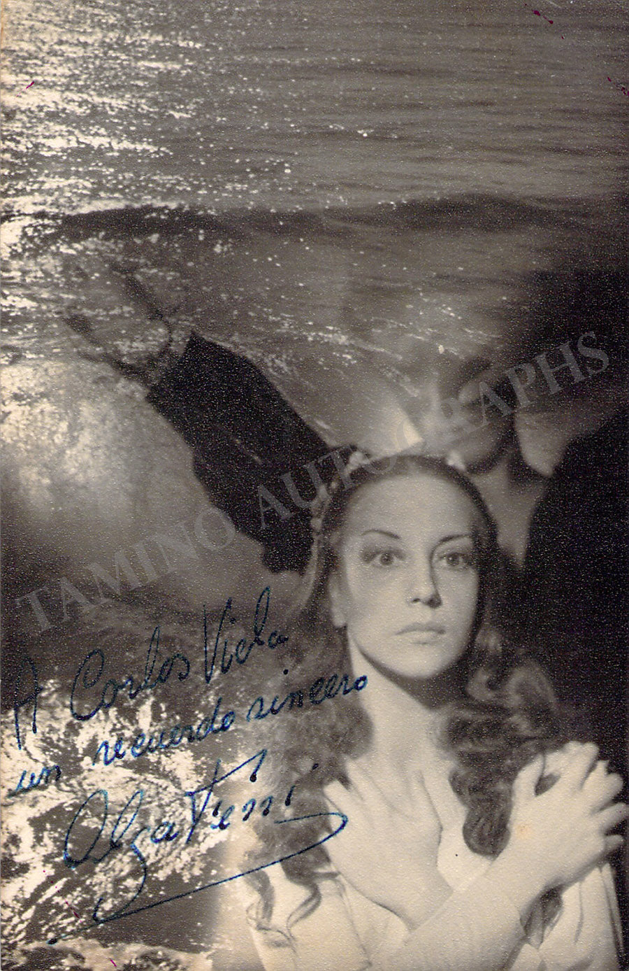 Beautiful black-and-white artistic photograph signed and inscribed by her with a short sentiment; ink-stamped on verso by Studio Sintonia (Buenos Aires). Size is 3.5 x 5.3 inches, in excellent condition.