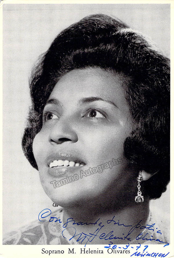 Colombian soprano (b.1936) whose full name is Maria Helenita Olivares. Signed publicity photograph, shown as herself, dated in Munich in 1971. Size is 4.25 x 6.25 inches, small creases on edges, otherwise in excellent condition.