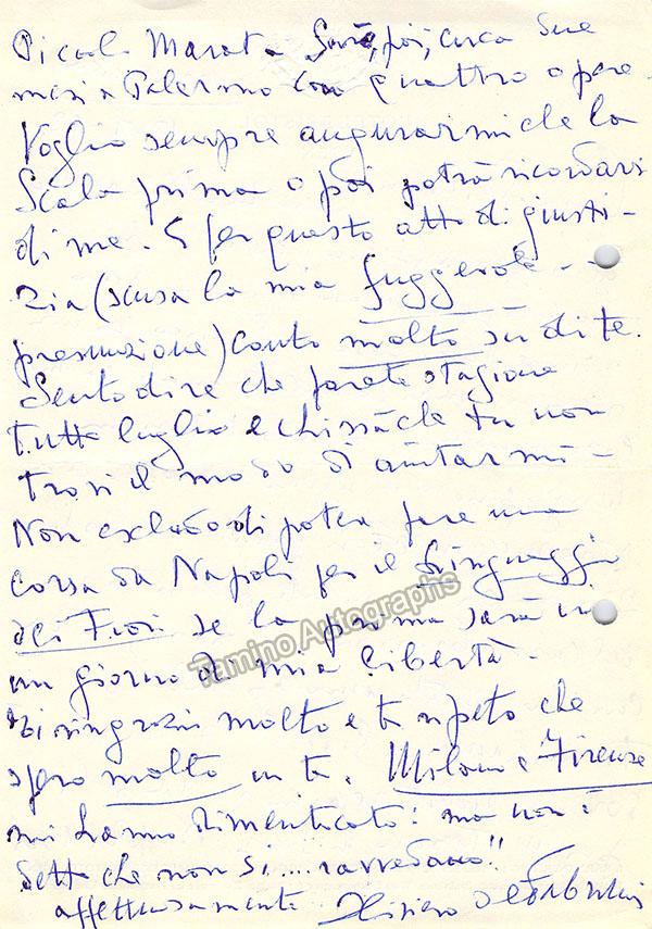 Italian conductor (1902-1982), who was also composer, associated with the opera repertory. Autograph letter signed, dated in 1963. Handwritten in Italian, sold untranslated. Two pages on one sheet, sized 5.75 x 8.25 inches, some storage holes, otherwise in very good condition.