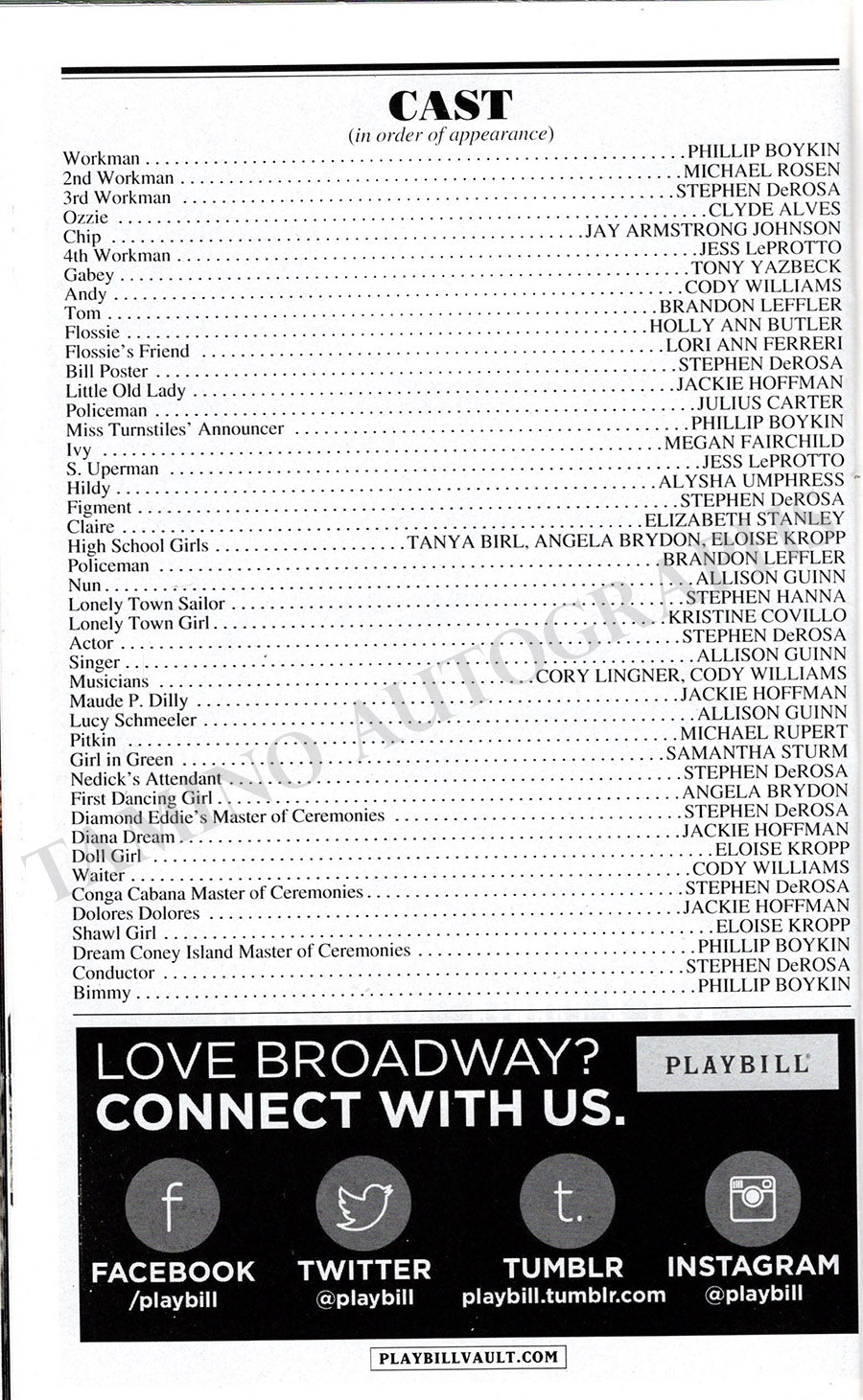 Original playbill for a Broadway production of the musical On The Town at Lyric Theatre; featuring Phillip Boykin, Jess LeProtto, Tony Yazbeck, Cody Williams, Lori Ann Ferreri, Jackie Hoffman, and many others; signed by many members of the cast.