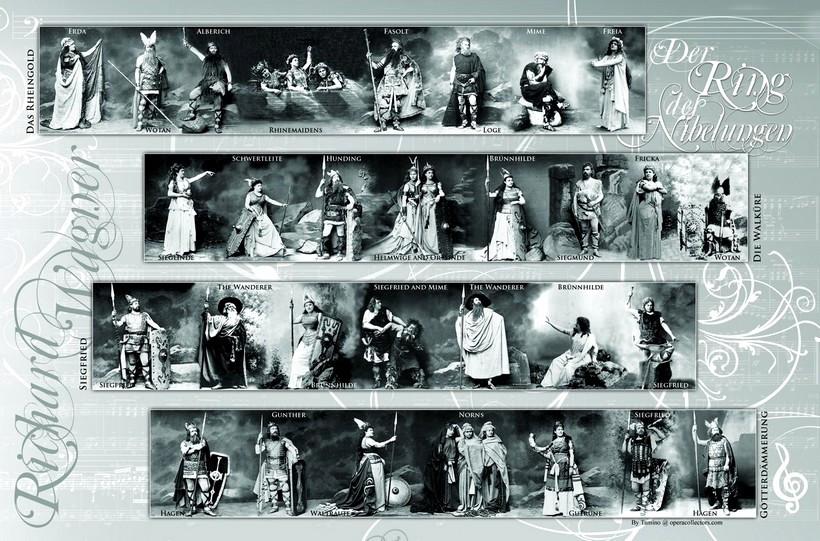 Beautiful poster with exclusive design showing a photo-collage of vintage opera photos from the 4 operas of the cycle Der Ring des Nibelungen by Wagner. Images are mostly from very early Bayreuth festivals. Each row corresponds to one of the 4 operas of the cycle. Includes several of the singers who performed the roles for the first time (role creators). Size is 17.25 x 11.25 inches. A truly great and very affordable item to frame or give as a give any opera fan!.