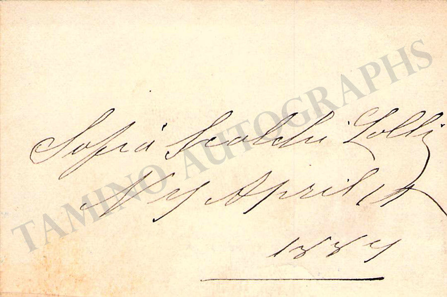 Fine card signed by her in New York, 1889, with her name printed on verso. Size is 3.5 x 2.4 inches, in very good condition.