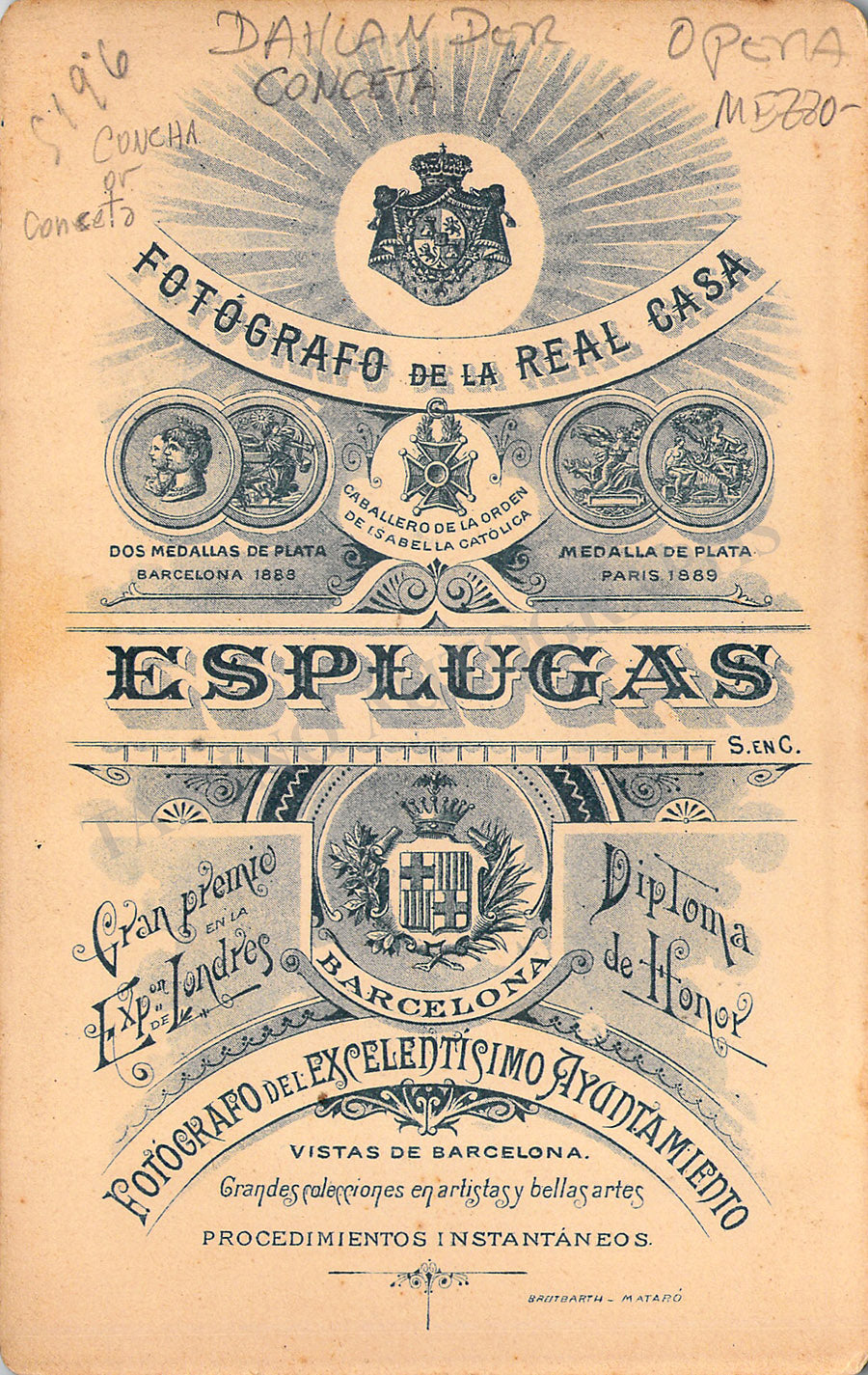 Original cabinet-style photograph of the singer (shown probably as Carmen) by photographer Antoni Esplugas (Barcelona). Size is 4.25 x 6.5 inches, some rust stains on the front, verso in excellent condition.