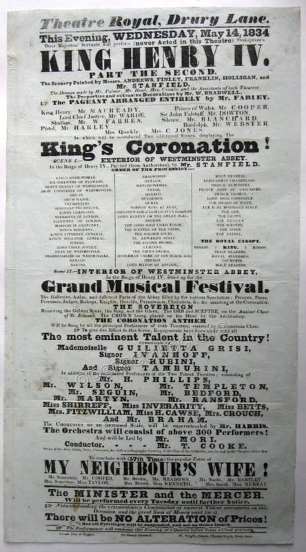 Beautiful original playbill from Theatre Royal, London, year 1834. Announces a performance of Shakespeare's "Henry IV", with a Scene II being a musical festival that includes star singers of the time: superstars soprano Giulia Grisi and tenor Giovanni Rubini, baritone Antonio Tamburini!. Large size: 9 x 16.5 inches, excellent condition. A beautiful piece of memorabilia from the 1800s, nice to collect or frame and give as a gift for any opera lover.