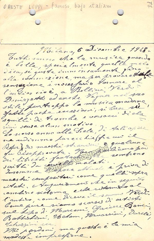 Italian bass (1870-1962), autograph letter signed, written in Milan, dated in 1948. 1 page, written in Italian, sold untranslated. Size is 5.5 x 8.5 inches, 4 small bullet holes at top outside the borders of the text and signature, otherwise in excellent condition.