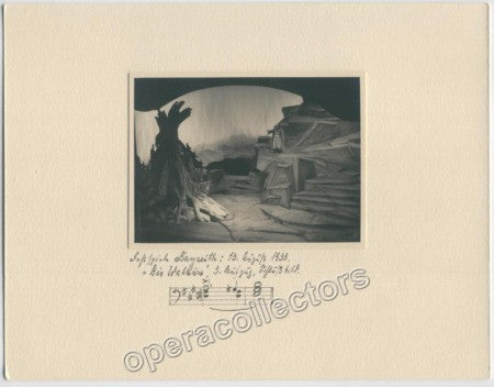Part of a set of ORIGINAL (unpublished) pictures of the Ring-performances during the Bayreuther Bühnenfestspiele, August 12-17, 1933. Extremely rare pictures of the first version of the legendary Preetorius stage decors which were used only in 1933, the second version was presented between 1934 - 1939. These are the probably the only prints made or still surviving.  All photographs 9 x 13 cm, mounted on cardboard 20 x 35 cm, with handwritten details in pencil about the performance and (musical) quotations corresponding to what is show in the picture. Rare photographic documentation of the Bayreuth Festival at the beginning of Nazi-period in Germany. In very good condition.