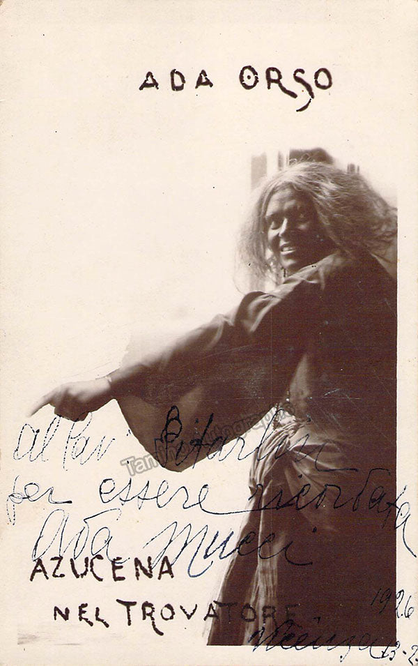Italian mezzo-soprano, signed postcard photograph, shown as Azucena in Verdi's Il Trovatore, inscribed and dated in 1926. Size is 3.5 x 5.5 inches, in excellent condition.