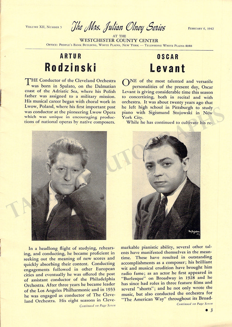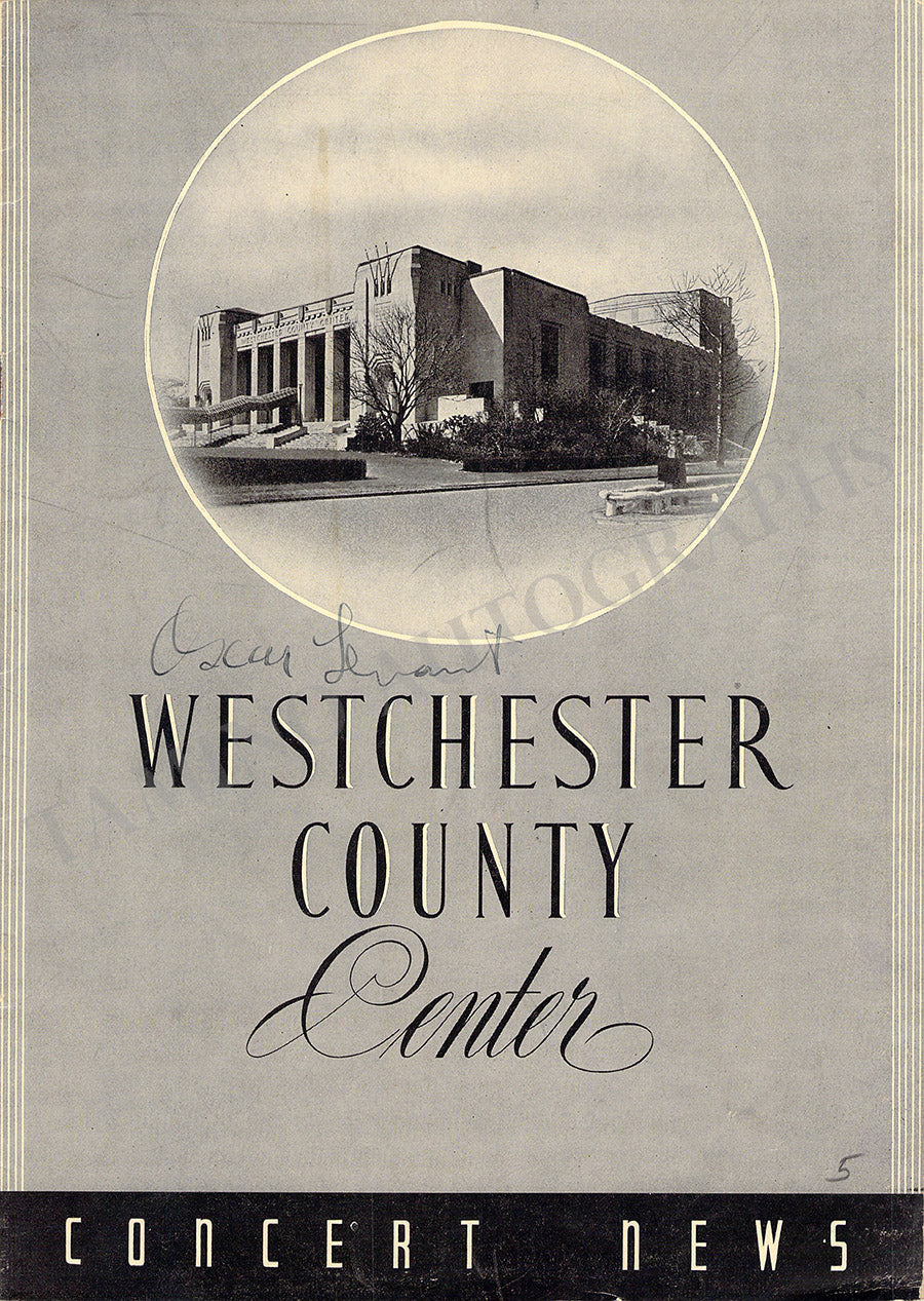 Program signed by the pianist on the cover for a performance of works by Gershwin, Beethoven, Kern, and Mendelssohn at the  Westchester County Center with the Cleveland Orchestra under Artur Rodzinski on February 6, 1942.