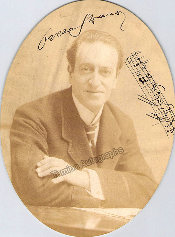 Fine oval half-tone photograph signed by the composer with a 3-bar music quote from an unknown piece.  Size is 4.2 x 5.75 inches, minor mounting traces on verso, otherwise in very good condition.