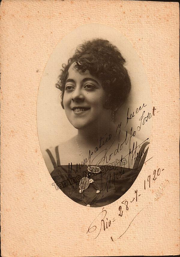 Large photograph signed and inscribed by her, shown as herself, dated in Rio, 1920.  A 5.75 x 9 inches photograph mounted onto cardboard for a total size of 9 x 12.25 inches; some wear on the cardboard, photo in excellent condition.
