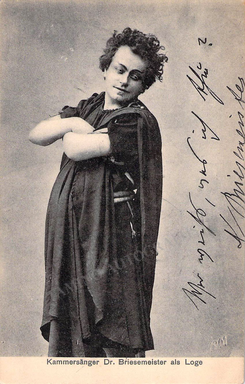 Fine black-and-white photo postcard signed by him with a short sentiment, shown as Loge in Wagner's "Das Rheingold". Size is 3.5 x 5.4 inches, in excellent condition.