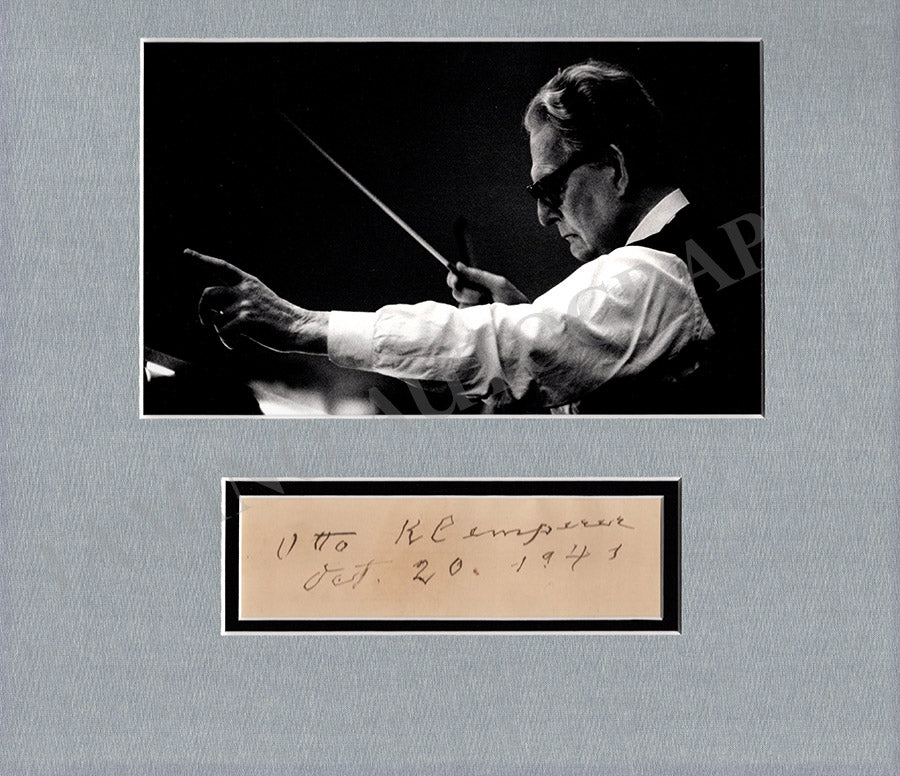 Small album page with his signature, dated October 20th, 1941 matted with a black-and-white photograph of him in rehearsal. Signature cut's size is 6.3 x 1.8 inches (visible window size), photo's size is 9.75 x 5.6 inches (visible window size), for a total size of 13.75 x 13.3 inches, in excellent condition.