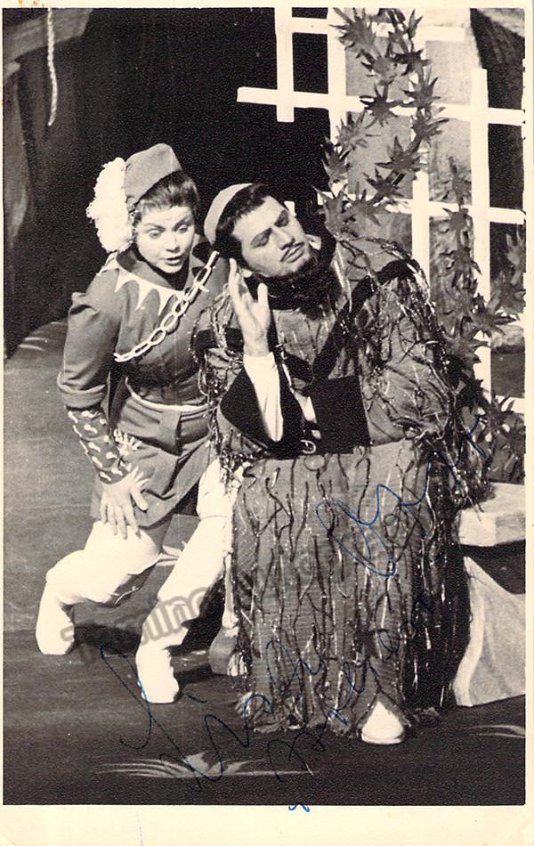 German soprano Lisa Otto (1913-2013) and Swiss tenor Ernst Haefliger (1919-2007), photo signed by both singers, shown in Le Comte Ory, opera Rossini. Stamped on verso by photographer W. Saeger, Berlin. Size is 3.25 x 5.25 inches.