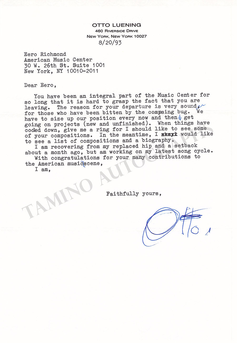 Luening, Otto - Set of 2 Typed Letters Signed (1984, 1993)