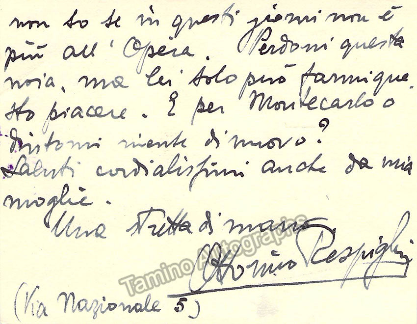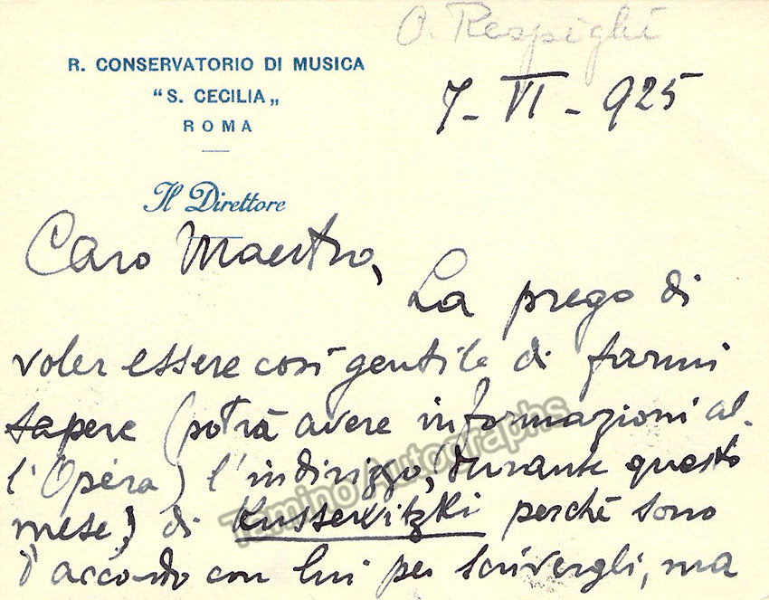 Autograph letter on a card with a letterhead of the Music Conservatory S. Cecilia, Rome, signed boldly by the composer on verso, dated in 1925, about musical business.  Size is 5 x 4 inches, in excellent condition.