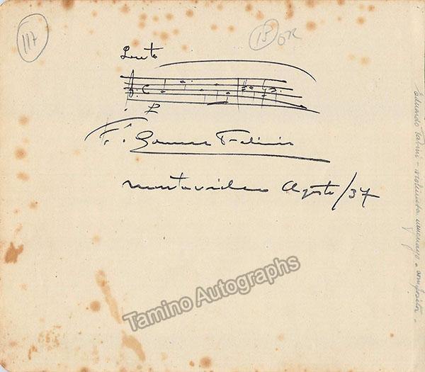 Autograph music quote on an album page, with 2 bars of music from an unknown piece, signed by him and dated in Montevideo, Uruguay, 1934.  Size is 6.75 x 6 inches, spotted rust, in good condition.