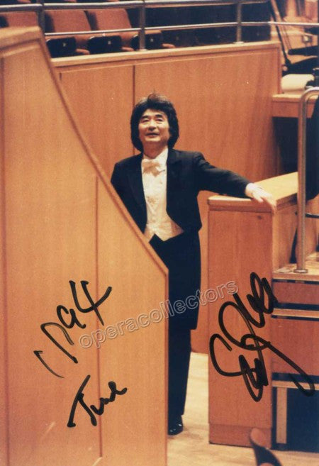 Photo signed by the Japanese conductor (now Music Director of the Boston Symphony and the Vienna State Opera). Size is 5 x 7.5 inches, stamped on verso by photographer Hermann Landvogt, dated June 1994