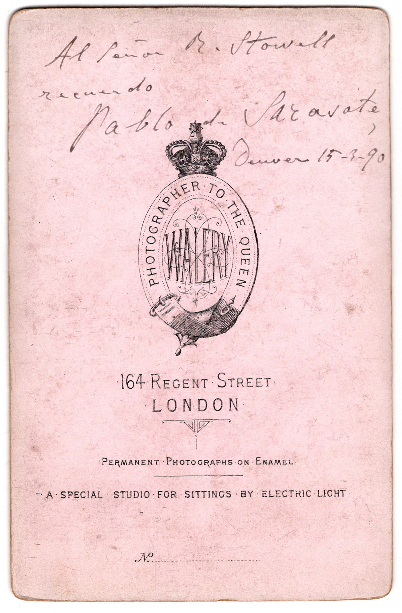 Nice cabinet photograph of him by Walery (London) signed by him on verso and dated in Denver, 1890. Size is 4.1 x 6.4 inches, in excellent condition.
