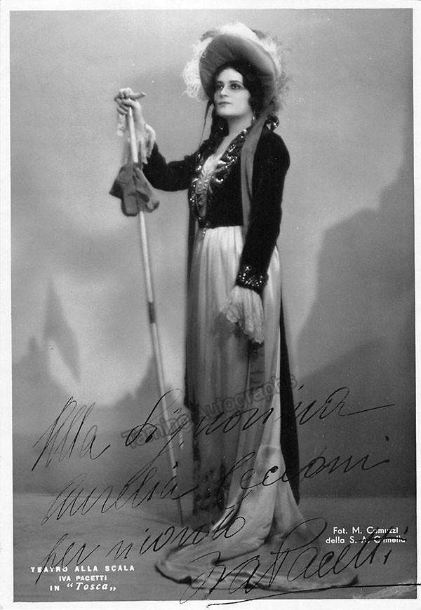 Italian soprano (1898-1981), signed photo postcard, shown in the title role in Tosca, inscribed. Size is 4 x 5.75 inches, in excellent condition.